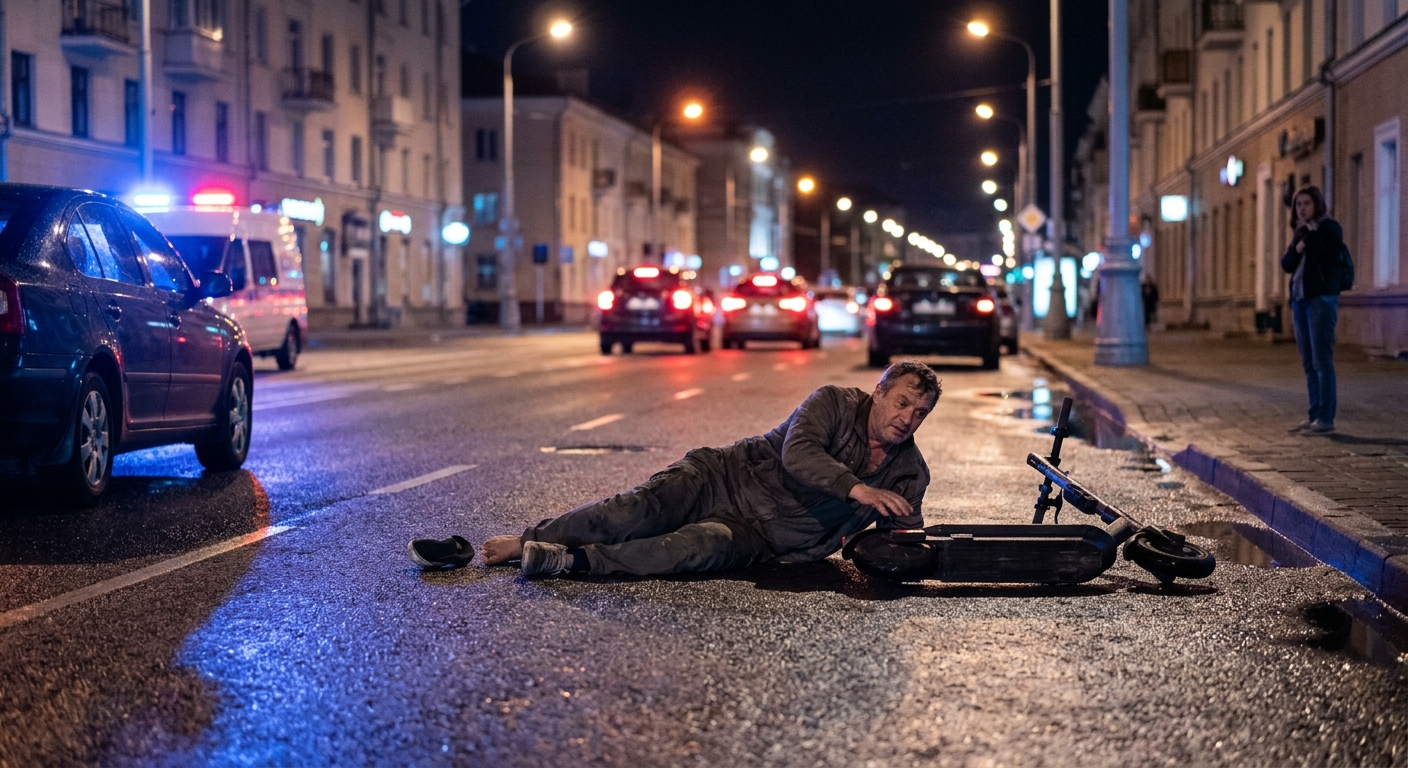 В центре Гомеля произошел инцидент с участием человека, управлявшего электросамокатом в состоянии алкогольного опьянения. Событие зафиксировано на улице Советской в темное время суток. По предварительной информации, мужчина двигался по проезжей части дороги, не справился с управлением и упал на дорожное полотно. В момент падения в непосредственной близости от него не находились другие транспортные средства, что позволило избежать более серьезных последствий.